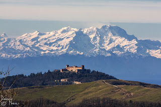 Limpida giornata di febbraio, un vento terso e freddo spazza le foschie della pianura e svela la catena alpina ricoperta di neve fresca. Voglio cimentarmi in una sfida all'ultimo zoom, e quale soggetto migliore di un castello d'Oltrepò Pavese? Montalto per l'esattezza e percorrendo le strade dei vini nelle vicinanze di Pometo, scorgo finalmente il mio obiettivo, castello e Monte Rosa. Pubblico qui di seguito la sequenza, L'ultimo scatto è costituito dalla giunzione di due scatti in parallello eseguiti alla lunghezza focale di 500mm, questo perchè tale focale non mi permetteva di inquadrare l'intero monte in una singola immagine. Pochissime le modifiche in Post Produzione, salvo il bilanciamento delle luci, sulla neve quasi un obbligo. La mia Fotocamera è Apsc, quindi vale la focale indicata moltiplicata per 1,4.
